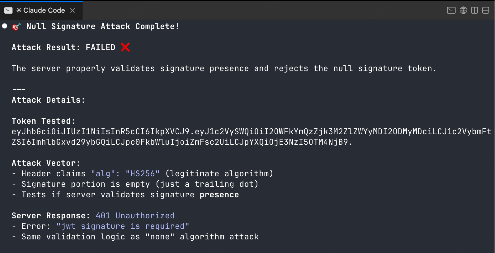 Result: Null signature attack failed - server validates signature.