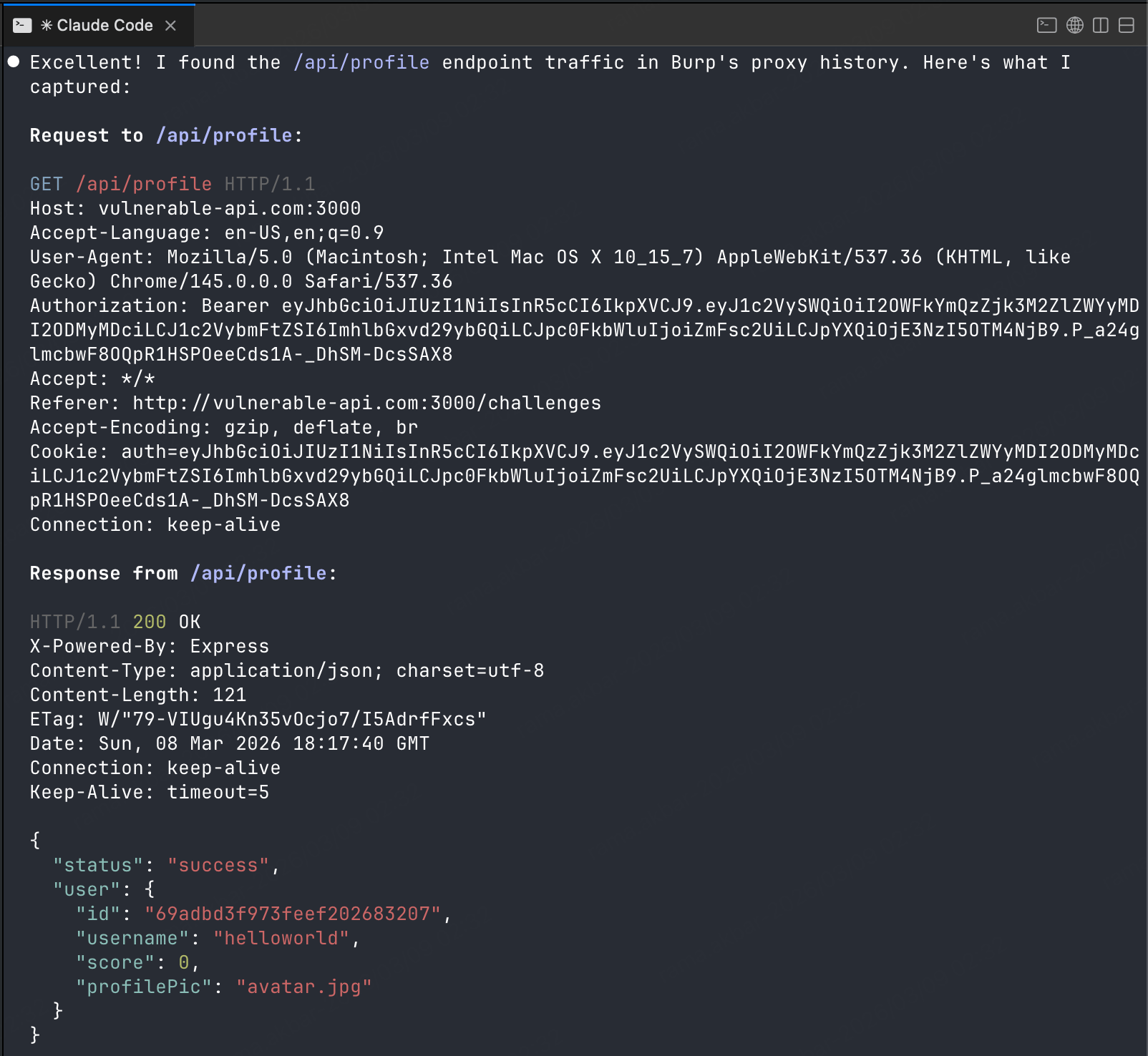 Use Burp MCP to inspect the /api/profile endpoint and capture both the request and responseWhy this matters: