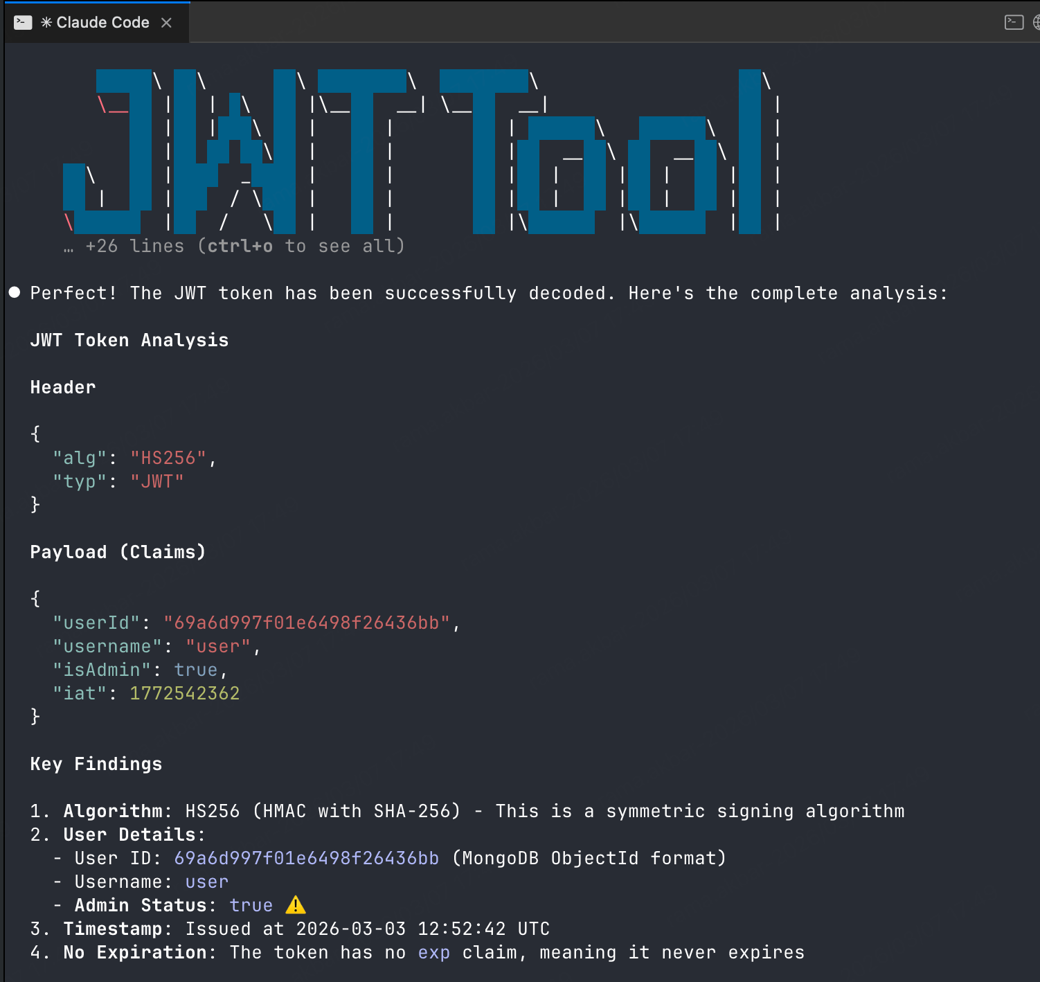 Claude runs jwt_tool to decode the token