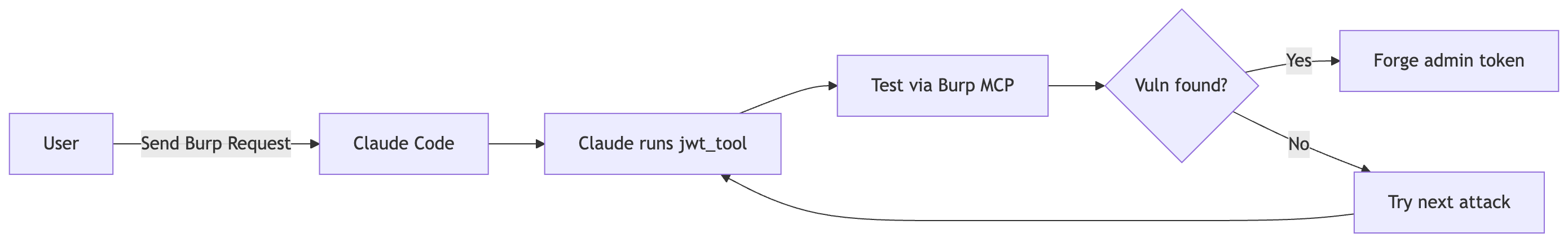 AI handles the orchestration. You describe the target token and expected attacks. Claude runs jwt_tool, tests payloads through Burp MCP, analyzes responses, and produces a findings report.